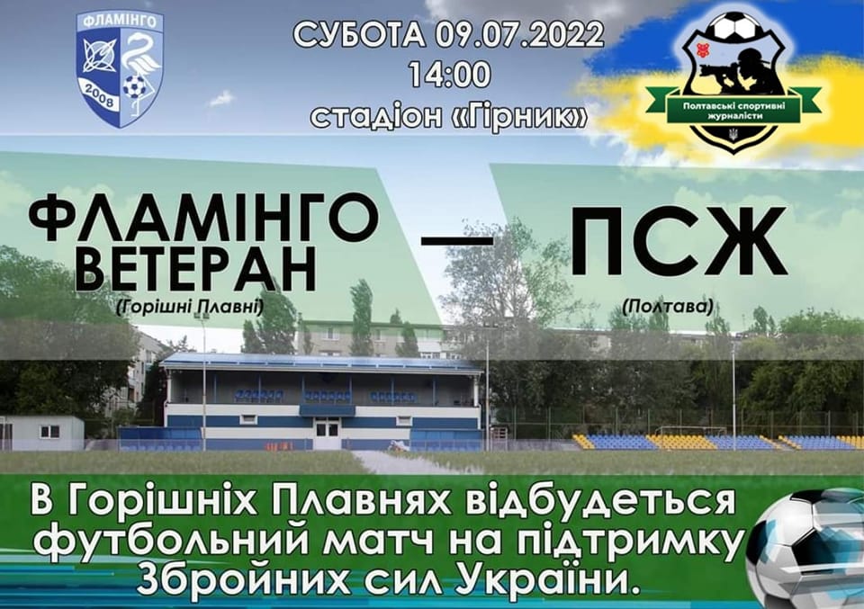 В суботу дев’ятого липня в Горішніх Плавнях на стадіоні “Гірник” відбудеться благодійний матч між командою полтавських спортивних журналістів (“ПСЖ”) та ветеранами місцевого “Фламінго”.