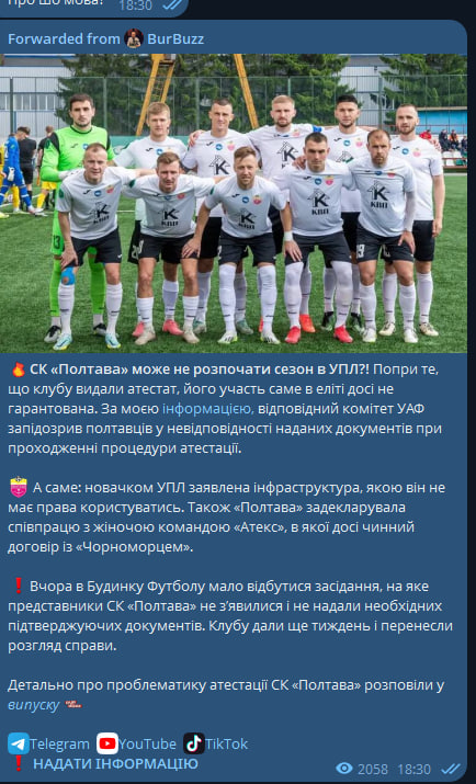Днями відомий в Україні футбольний інсайдер Ігор Бурбас оприлюднив інформацію про те, що СК «Полтава» можуть не допустити до участі в УПЛ. За словами Бурбаса, полтавський клуб підозрюють, утому, що вони надали документи про інфраструктуру якою не мають права користуватися. А також — вказали в якості своєї жіночої команди (це умова для клубів УПЛ) — київський «Атекс» у якого, за інформацією все того ж інсайдера, чинний договір про співпрацю з одеським «Чорноморцем».