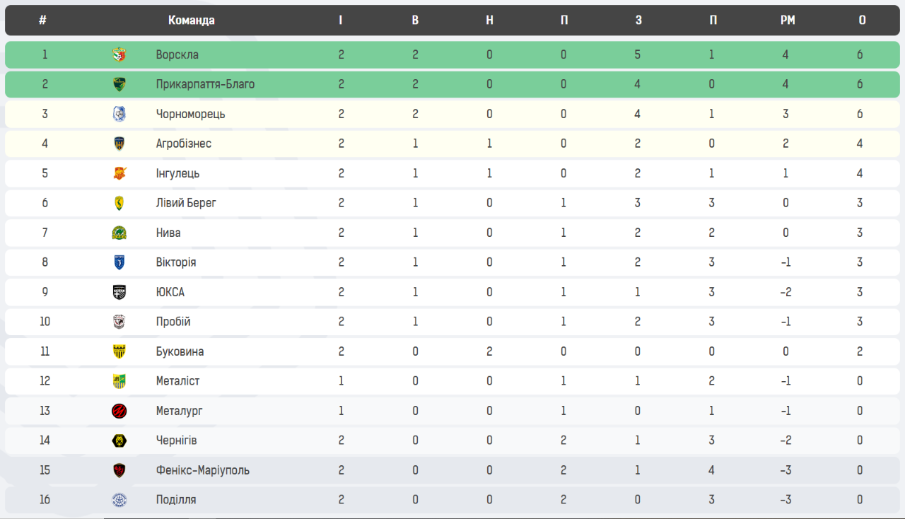 Актуальна турнірна таблиця Першої ліги після двох турів