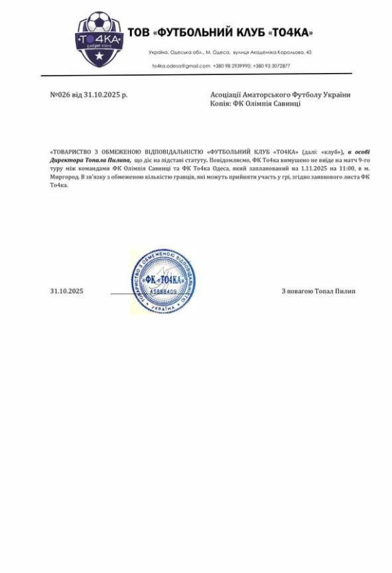Сьогодні у Миргороді на стадіоні «Старт» мав відбутися матч дев’ятого туру ЧУ з футболу серед аматорів між «Олімпією» з Савинців та одеською «То4кою». Втім, одесити не приїхали, вмотивувавши обмеженою кількістю футболістів.