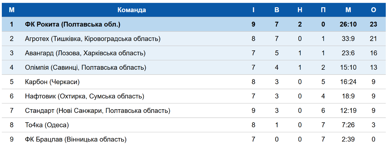 «Рокита» і «Олімпія» з Савинців у цьому турі свої матчі виграли. Отож підсумкова таблиця першого кола у Групі 2, де виступають команди з Полтавщини виглядає так: