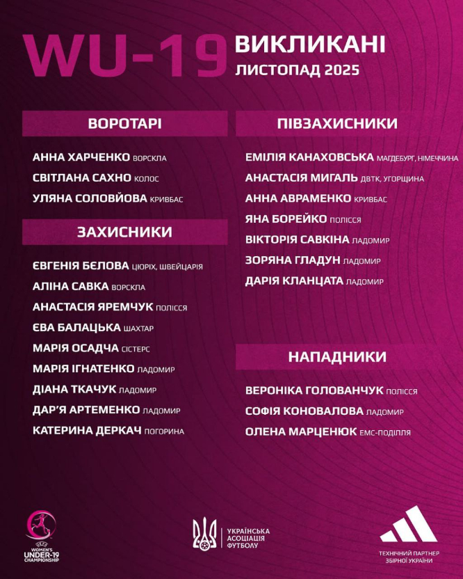Тренерський штаб дівочої збірної України U-19 оприлюднив список футболісток, яких викликано на матчі кваліфікації до Євро-2026. Серед збірниць — дві футболістки полтавської «Ворскли»: голкіперка Анна Харченко та захисниця Аліна Савка. Загалом, склад виглядає так: