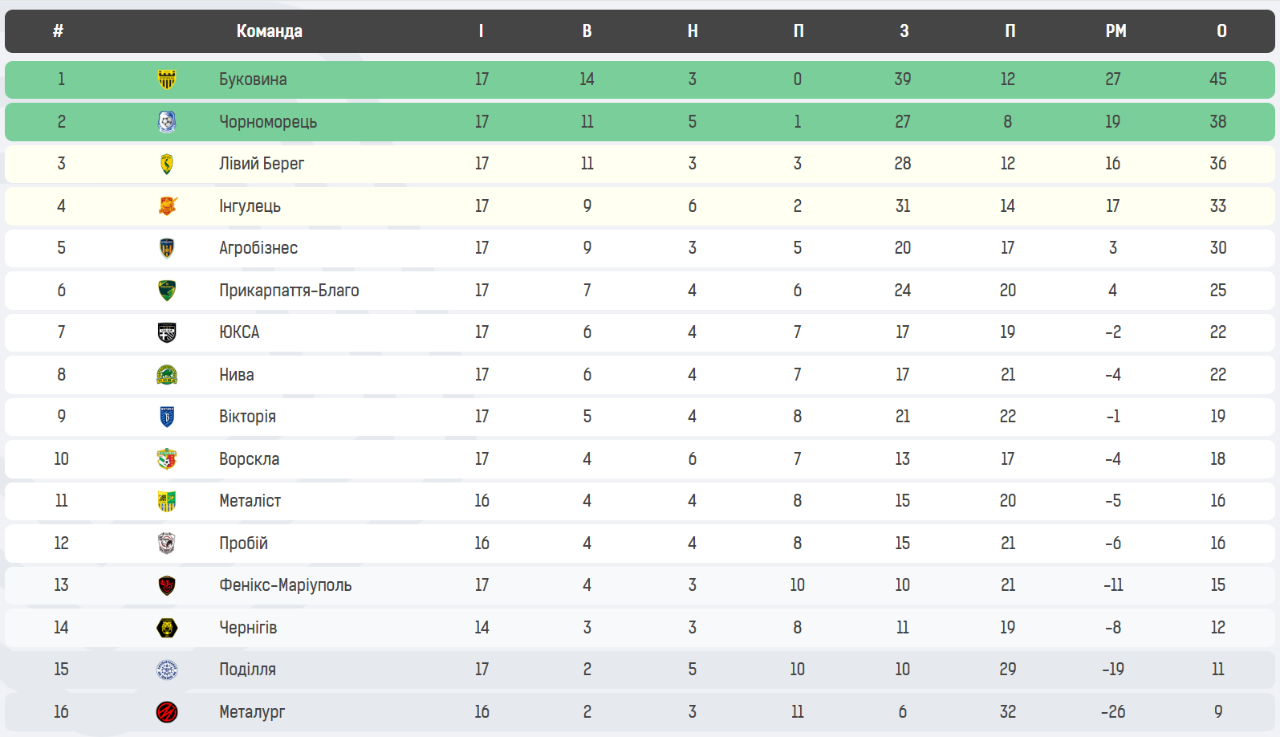 Турнірна таблиця після сімнадцяти турів виглядає так: