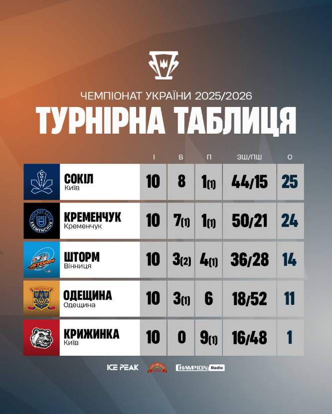 Прямо зараз таблиця ЧУ з хокею виглядає так: