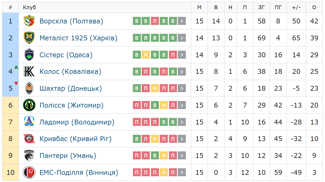 Ворсклянки закінчують рік на першому місці в таблиці.