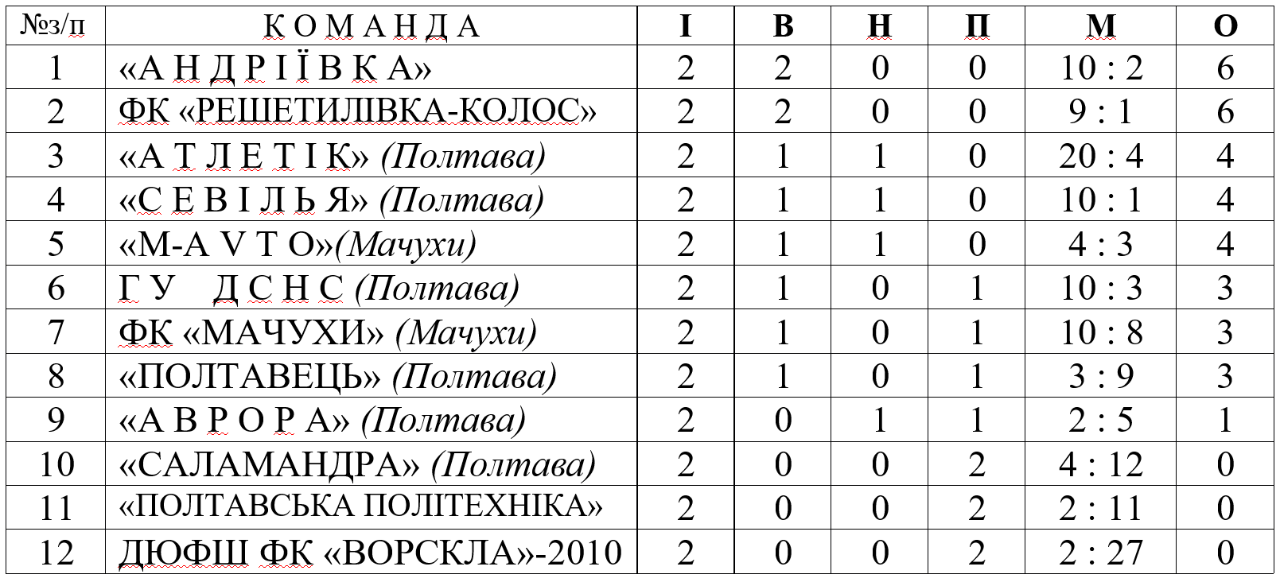 - «Севілья» (Полтава) — ДЮФШ ФК «Ворскла»-2010 — 9:0
