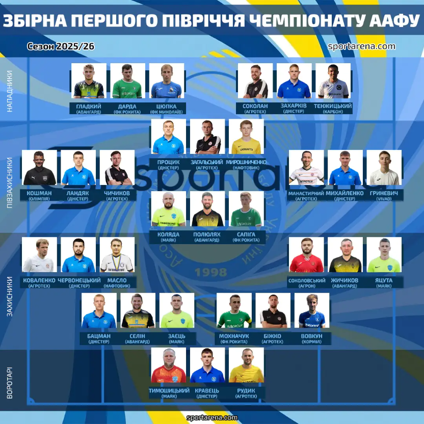 Асоціація аматорського футболу України оприлюднила символічну збірну (ТОП-33) футболістів першої половини сезону 2025/2026. До списку кращих потрапили четверо футболістів з Полтавщини, троє з «Рокити», яка очолює турнірну таблицю Групи 2, та один з «Олімпії» з Савинців. Ось кого асоціація включила у ТОП і як це аргументувала.