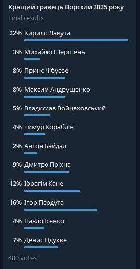 Напередодні новорічних свят вболівальники «Ворскли» у своєму телеграм-каналі обирали кращого футболіста 2025 року. Після обговорення в опитування включили й гравців «старої» команди, яка в кінці сезону 2024/2025 вилітала з УПЛ. Отож у голосуванні переміг чинний голкіпер команди Кирило Лавута. В опитуванні взяли участь 480 уболівальників. Кирило Лавута набрав 22% голосів. Друге місце в Ігоря Пердути (16%), замикає трійку Ібрахім Кане (12%).