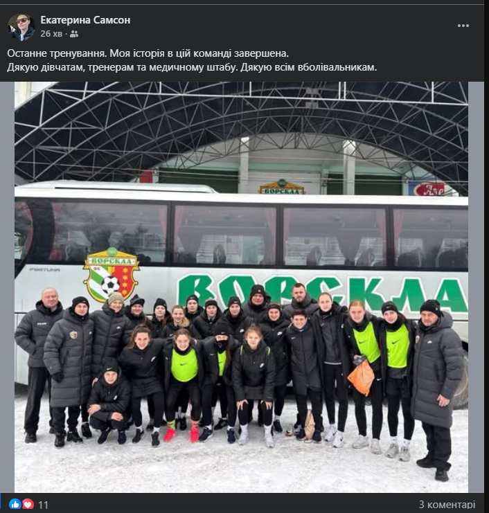 Основна воротарка ЖФК «Ворскла» Катерина Самсон покидає команду. Про це вона повідомила у своїх соціальних мережах.
