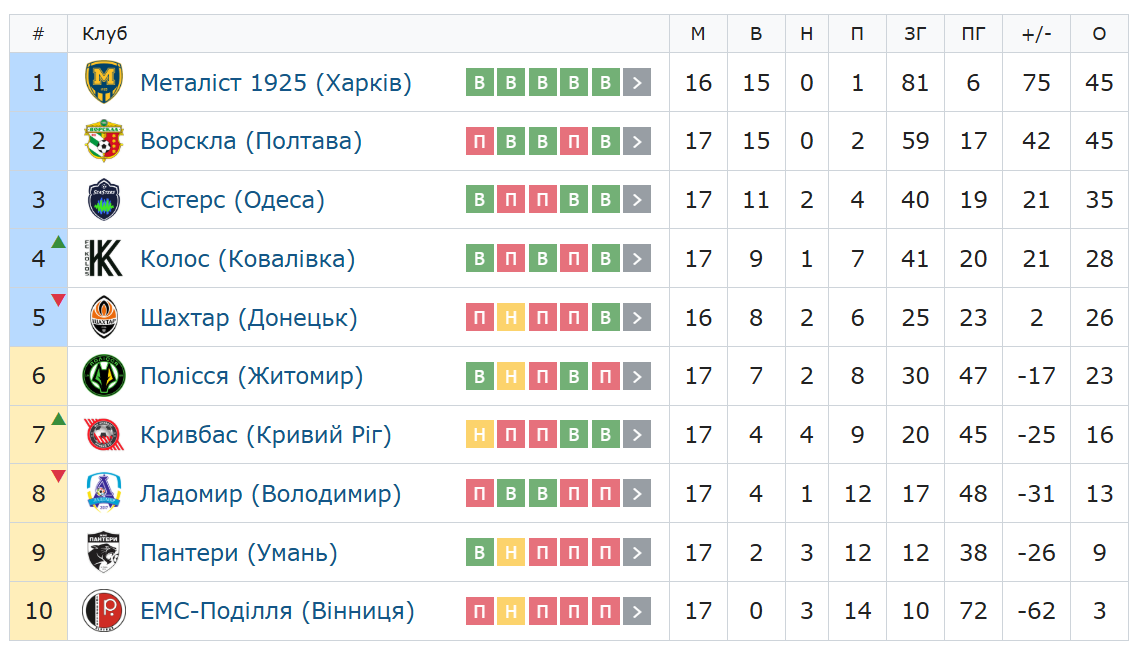Прямо зараз таблиця Вищої ліги виглядає так: