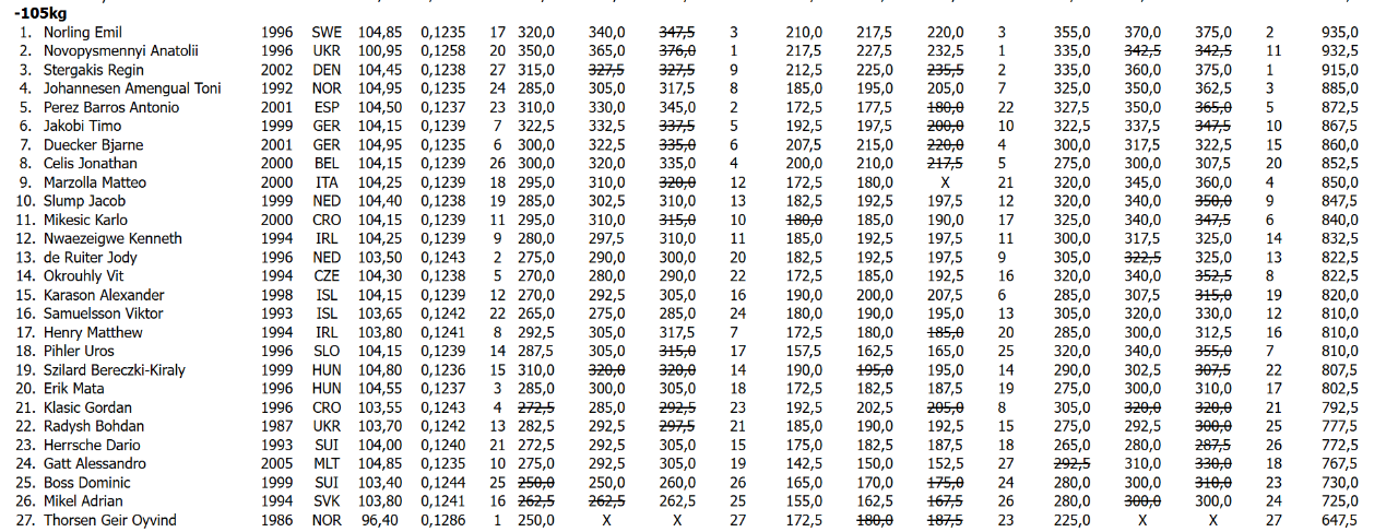 Анатолій Новописьменний здобув «срібло» у ваговій категорії до 105 кг серед чоловіків. Він показав 365 кг у присіданні. Потім витиснув лежачи 232,5 кг. І наостанок у становій тязі підняв штангу вагою 335 кг. Саме у становій тязі його і перегнав швед Еміль Норлінг. У підсумку Анатолій набрав 932,5 кг і посів друге місце. Чемпіоном тут став вищезгаданий Еміль Норлінг (935 кг). «Бронза» у данця Регіна Стергакіса (915 кг.).
