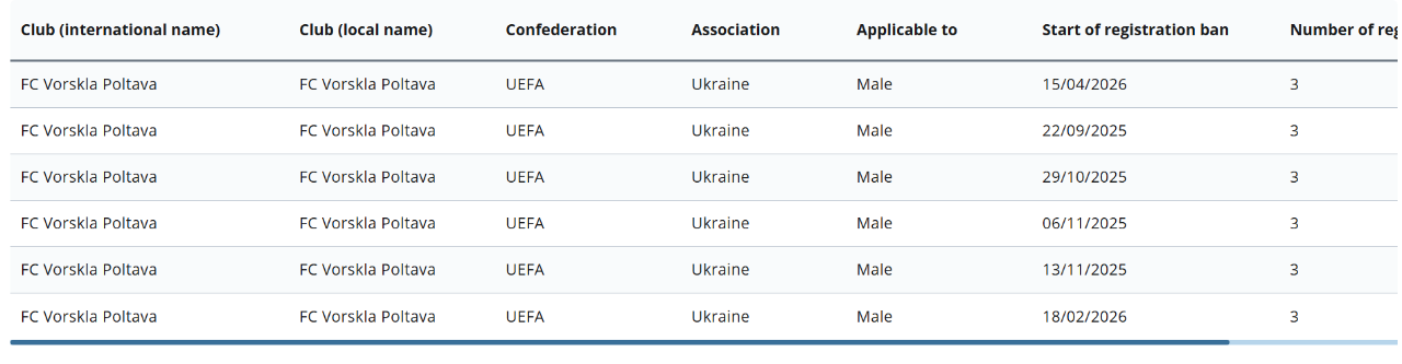 П’ятнадцятого квітня на «Ворсклу» наклали вже шостий за ліком трансферний бан. Нова заборона з’явилася у офіційному списку FIFA Registration Ban List.