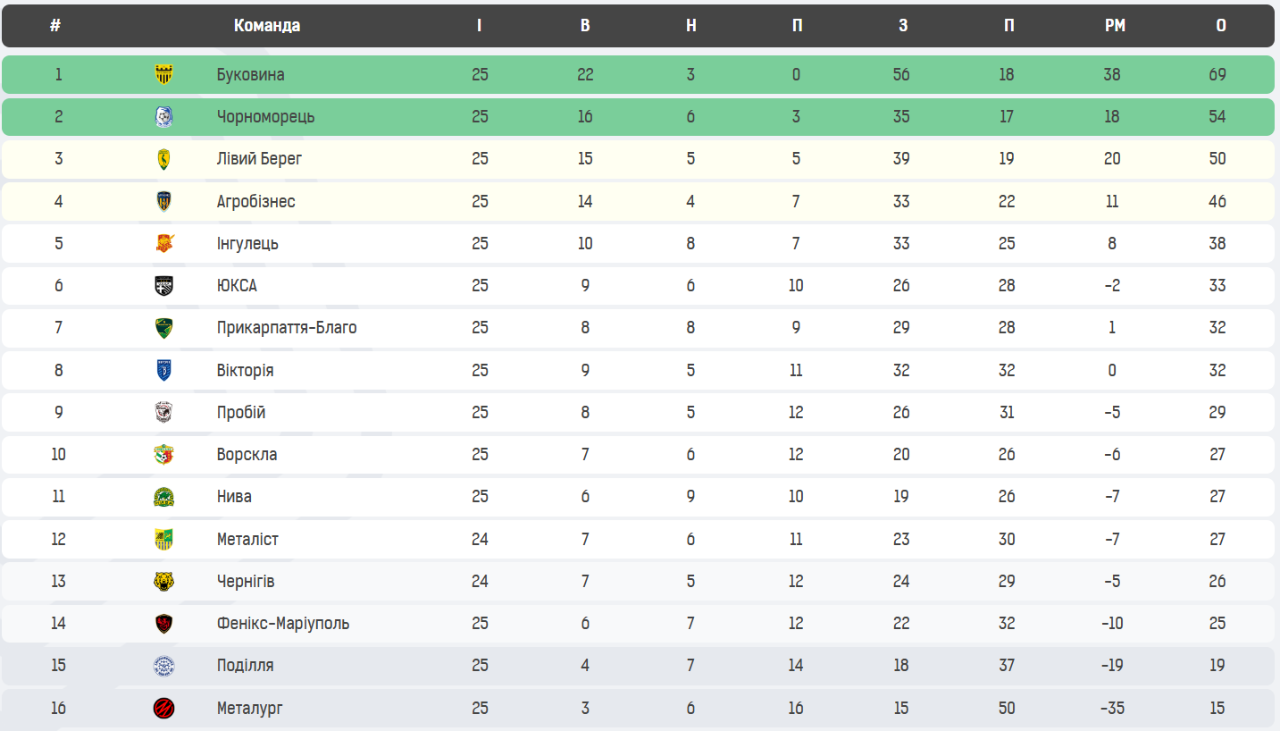 Після 25-ти турів таблиця Першої ліги виглядає так: