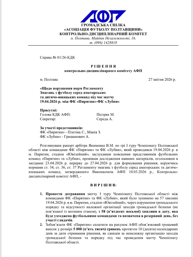Дев’ятнадцятого квітня у Пирятині на стадіоні «Ювілейний» проходив матч першого туру Чемпіонату Полтавської області з футболу між ФК «Пирятин» та ФК «Лубни». У другому таймі матч був припинений через сутичку між футболістами та вболівальниками, яка переросла у масову бійку. Матч призупинили за рахунку 1:1 і не дограли.